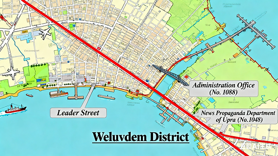 The only overseas highway (shown red in the map) connects the most significant departments in Upra and the other two districts. There is also a marine highway (came from sea reclamation) called the Leader Street near the port. Near the entrance of the cross-sea bridge is the Administration Office (NO. 1088). Generations of leaders work in the Administration Office and issue important notifications. The News Propaganda Department of Upra (NO. 1048) is situated near the fork junction of the overseas highway. All the journalistic materials and important articles are produced right there.